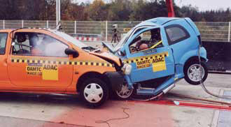 Provet gjordes med en typisk mopedbil, med stålrörsram och plastkaross, som krockades mot Renaults minsta bil Twingo med 40 km/h. Resultatet är skrämmande: mopedbilen kollapsade helt, den bröts av på mitten. Ratten försköts 10 cm bakåt och träffade förardockans huvud, som registrerade mycket svåra skador. Avgassystemet lossnade och tanken sprack så att bränslet rann ut.