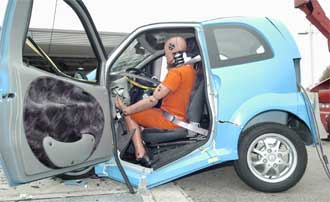 Krockdockan i mopedbilen fick mycket svåra skador, bland annat i huvudet sedan ratten trängt in 10 cm i kupén. Krockkuddar ingår inte i utrustningen.