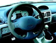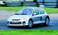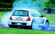kul som helst på en racerbana. Snurrigare bil går inte att hitta. Snurrig på alla sätt. Bara tanken på att hänga i en treliters V6-motor baktill i en småbil! Tanken föddes för ett par år sedan och prototypen har valsat runt på bilsalongerna för att pejla intresset. Redan förra året kom man igång med en racingserie med Clio V6:or, men nu är det alltså äntligen dags för oss vanliga dödliga att känna på besten. Och gissa om man känner sig dödlig bakom ratten! Redan vid första ögonkontakten förstärks självbevarelsedriften. När man sedan börjar kolla fakta och ser att tomvikten fördelar sig så att framhjulen bär 535 kilo och bakhjulen 800 och sen lägger ihop det med alla rykten om benägenheten att snurra, så är det med en viss darrning på manschetten man tar plats. Inredningen är en riktig be-svikelse. Allt är standard-Clio, eller åtminstone standard 172-hästars Clio. Tittar man över axeln är dock bilden en helt annan. Direkt bakom framstolarnafinns ett litet utrymme med ett lastnät, lagom för tröjan, jackan eller handväskan. Sen är det fullt. Av motor. Trodde man sig sitta i en vanlig Clio 172 så försvinner den illusionen med besked i samma ögonblick startnyckeln vrids om. Det låter stort, mycket och sexigt. Det vill säga sexcylindrigt med en extra spets. Tillhör man ljudfreakarna får man nästan lust att köra med de dubbla motorluckorna av så att hela kupén förvandlas till en resonanslåda. Men efter en stunds körning inser man vitsen med de dubbla locken. Till och med när de är på hör man nämligen fullt tillräckligt av motorn. Råkar man sen har rutan i förardörren öppen ackompanjeras ljudet dessutom av ett tydligt flåsande från gasspjället som hörs genom luftintaget bakom dörren. Det är inte utan att man får visioner av racersportvagnar och Le Mans. Gissningsvis har Tom Walkinshaw Racing som utvecklat och bygger bilen på uppdrag av Renault lagt ner mycken möda på att stämma av både insugs- och avgasljud så att det ger rätt vibbar. Efter det försvinner tyvärr en del av racingillusionen. Pedalstället känns lite vekt och växellådan inte helt precis. På en punkt är den dock racerbilsmässig så det förslår den har precis så begränsat styrutslag som en racer. Det betyder en svängradie typ supertanker och många omtag vid parkering.