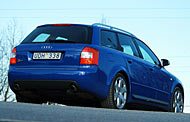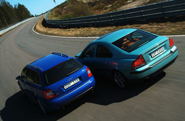 Så länge man håller högerfoten mot golvet går S60 R rysligt snabbt, men lättar man på foten och går på igen får man finna sig i att vänta på att turbon ska ladda fullt igen. Detta är ingenting som en någorlunda sund bilist kommer lida av utan mer ett ”problem” som uppkommer när man hårdkör på bana. Vid just sådan körning lär man sig mycket om en bil – eller två, som i det här fallet. Man kommer mycket närmare bilen än man någonsin kan göra på allmän väg, och kan koncentrera sig till hundra procent på körningen utan att behöva ta hänsyn till yttre faktorer såsom trafikregler, andra trafikanter och fartbestämmelser. Dessutom främträder skillnader mellan dessa två bilar som inte hade märkts utan ban-momentet. Volvos överlägsenhet i snäva kurvor, till exempel. S60 R styr in klart bättre i dessa typer av böjar och känns på det hela taget väldigt följsam. Tack vare aktiva dämpare så kan föraren själv ställa hårdheten i tre förvalda steg; Comfort, Sport och Advanced. Det är stor skillnad mellan de olika lägena i S60 R; det mjukaste är komfortabelt för finåkning, det mittersta är stramt för till exempel en tur på den kurviga favoritvägen, och det hårdaste är snudd på stumt. Förändringen mellan två lägen är klar innan du ens hunnit släppa knappen på intrumentbrädan. Jämför man de två bilarna hårdhetsmässigt så motsvarar S4 S60:s Sportläge, på ett ungefär. Mittsverigebanan utanför Härnösand där vi testar bilarna, har i huvudsak bara långsamma kurvor och långa rakor och runt varvet är bilarna i stort sett lika snabba. Audi vinner mark på rakorna i kraft av 44 hästar mer än Volvos 300, men i de snäva kurvorna kommer S60 ikapp. Audi S4 kasar över nosen och det är praktiskt taget omöjligt att få ut häcken i bredare spår; fyrhjulsdriften ger bra fäste och dragkraft på alla hjul. Volvo S60 R är också fyrhjulsdriven (Haldex-koppling) men har en mer neutral chassibalans. Det är fysiskt möjligt att få ut bakvagnen men insatsen blir avsevärd då asfalten är torr, farterna höga och räckena känns väldigt närgångna i vissa lägen. Båda bilarna har ESP som standard. Inte speciellt förvånande på bilar av den här kalibern, men inte mindre tacksamt för det. S4 och S60 R är ypperligt vägsäkra bilar tack vare kompetenta chassin och fyrhjulsdrift. Bör vara riktiga vinterjärn, båda två. Rent ljudmässigt sitter man gärna ett par extra varv i S4, motorn trivs i de högre vartalsregionen och har en underskön ton under acceleration. Volvos turbofemma råmar friskt men utan finess, och vid hastiga gasuppsläpp poffar det lite ur avgaspiporna. Ju mer man nöter på banan, desto mer tilltalas man av Volvons körmässiga kvaliteter, även om styrningen kunde vara lite mer kommunikativ. Och visst, ibland märks en liten turbofördröjning. Men när den väl skottar på, då gör den det med bestämdhet. |
