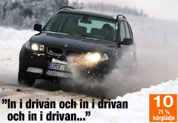 Förklaringen till sistaplaceringen hittar vi kort och gott i fyrhjulsdriftsystemet kallat xDrive. Det är ett elektroniskt styrt drivsystem som i teorin är briljant. För mycket understyrning skickar ögonblickligen kraft till bakhjulen, och tvärt om. Systemet ska gripa in långt före ESP-systemet och kan fördela kraften till enbart en drivaxel, men i grunden har X3 40/60-drift fram/bak. Sitt upp i det höga sätet. Den fina raka sexan på 231 hk spinner BMW-mjukt. Inga fel här – även om motorn inte känns lika sportig som i en 330i. Ut på vår tre kilometer långa isbana – och i första böjen gör du som resten av testlaget, understyr rakt upp i plogvallen trots att du kört lugnt. Bärgare tack! När elektroniken känner av att bilen understyr skickas all kraft till bakhjulen som skjuter på ännu mer och snödrivan väntar. På riktigt hal is funkar xDrive dåligt. Testlagets betyg för balans är låga 2,5 på en femgradig skala och Stig Blomqvist skakar på huvudet och talar om simpel pickup. Fjädringen är för hård för vinterföre och vi imponeras inte heller av greppet. På landsvägen funkar X3 bättre, men någonstans har BMW-generna inte riktigt följt med i denna stadsjeep. Gamla X5 är tveklöst en fränare vagn. |