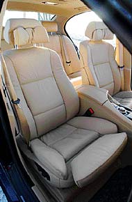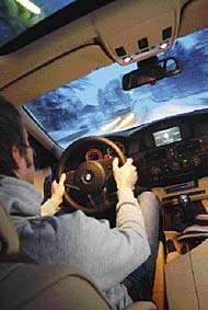 Med vetskapen om en motoreffekt i nivå med förrförra M5:an är det med spänning jag vrider om tändningsnyckeln. Enbart tomgångsljudet på BMWs prestandamodeller brukar ju leda till välmående. V8:an studsar igång direkt, dämpat, utan något behov av uppmärksamhet. Det som istället stjäl intresset är siffrorna i vindrutan… För 13 900 kronor får du hastighet, navigationspilar och varningssymboler projicerade i rutan. Inte direkt nyskapande, men genialiskt. Flygindustrin har använt tekniken i åratal. Av en anledning, att aldrig behöva släppa blicken från det som är allra viktigast; det som händer framför fordonet. Siffrorna syns lika bra i starkt solljus som på natten och det bidrar till att bland annat hela tiden ha bra koll på hastigheten. Valet av information i rutan är inställbar. Tyvärr hamnar informationen lite för lågt på rutan vilket kan göra den svåravläst vid vissa körställningar. En höjdinställbar projicering vore det ultimata. ”Bakgrundsljuset” som blir runt texten i rutan känns dock lite billigt i det exklusiva sammanhanget. Väljer du även till klimator/Aktiv fartkontroll, 19 500 kronor extra, är fortkörningsböter historia. Ställ hastigheten du vill hålla. Tillåter trafiken endast lägre hastighet håller bilen ett konstant avstånd till fordonet framför. När det blir fritt ökas farten. Systemet jobbar med en radarsensor och upptäcker fordon på 120 meters håll, utan att störas av fordon i andra filer. Mercedes har haft ett liknande system med ”aktiv farthållare” länge. Tillsammans med möjligheten att kunna välja bland annat röststyrning av en rad funktioner, samt den aktiva styrningen, får dock 545i högt betyg för ”ny teknik i klassen”. Motorn delar BMW 545i med syskonen 645i och 745i. Den varvar från botten till stoppet vid 7 000 varv utan minsta vibration. En riktig juvel som här, liksom i 745i, gör sitt jobb diskret och utan att någon gång låta ansträngd. Vridmomentskurvan har en topp på drygt 450 Nm vid 3 600 r/min. Fullgasacceleration är en ganska mäktig upplevelse. Sprinten till hundra avverkas på 6,4 sekunder, ytterligare knappt 8 sekunder senare passeras 160 km/h. Men maskeringen av fartökningen är stor och det är först när bilen får sträcka ut på motorväg med fri fart som man blir riktigt imponerad. Snabb, smidig och grymt effektiv. Betyget 91 procent för motor och växellåda är imponerande. Diskretion tycks verkligen vara ledordet BMW-teknikerna jobbat med vid utvecklingen av avgassytemet. Jämfört med syster 645i är avgasljudet extremt dämpat. Men den lilla ljudmattan som letar sig in i kupén vid urvarvning är faktiskt mer BMW-sexa än ljudet av åtta cylindrar. Att prestera men inte märkas går igen i allting. Ingenting exteriört avslöjar att det inte rör sig om en ”simpel” 520i. Inte ens vid start på parkeringsplatsen är det någon som hör någon större skillnad. BMW 545i är verkligen en bil för den som inte behöver skylta med vad han har. Tittar man in i bilen finner man en väldisponerad förarplats med lagom mycket knappar. iDrive har dammsugit interiören på knappar vilket i och för sig har både för- och nackdelar. Men det ger ett ganska prydligt intryck. Testbilen är utrustad med komfortstolar för 9 200 kronor extra. De är ett under av inställningsmöjligheter och ergonomi. Med ett betyg på 96 procent i sittkomfort är det inget snack. Världsklass! Efter nästan 140 mil och tre dagars testande hittar vi plötsligt ännu en knapp med vilken man kan pumpa upp sidostödet i stolen. Med de justerbara huvudkuddarna runt nacken, det tvådelade ryggstödet lagom framvikt i överkant för att stödja axlarna, och sidostödet uppumpat sitter man som i ett mjukt, men bestämt skruvstäd. Underbart.