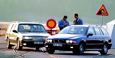 Vägegenskaperna är mycket bra i båda bilarna. Kurvneutrala och lätta att hämta hem. Med full last vinner BMW på sin nykonstruerade bakvagn och klarar sig trots sin betydligt tyngre last lika bra som Volvo vid häftiga undanmanövrar. Volvos styrning känns däremot kvickare. Vändradien är också mycket bättre. BMW lider lite av "Honda Legend-syndromet ", bilen är så tyst, balanserad och värdig att den i jämförelse med Volvos starkare nerv får en liten touch av tristess. Bromsarna är mycket bättre i 528:an. Volvos bromsar är klenare och mattas betydligt när de blir varma. Bränsleförbrukningen är två liter högre per 100 km i V90. Något som ger mer utsläpp och sämre miljöpoäng. Den passiva säkerheten bör däremot vara likvärdig, båda har sidokrockkuddar och förarkudde. BMW har även passagerarkudde som standard. Volvo har anammat kritiken och säljer sin passagerarkudde som tillval för 2 750 kronor. BMW vinner dock poäng på den aktiva säkerheten. Förutom ABS som är standard på båda bilarna har 528 automatisk stabilitetskontroll och antispinn (ASC+T). Något som Volvo definitivt skulle behöva i vinterväglag. |