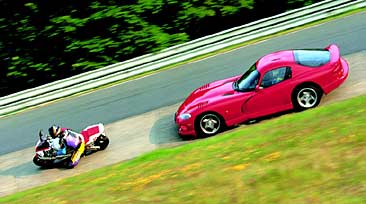 Motorcykelns bättre acceleration ut ur svängarna ger högre tempo på rakorna; Schwedenkreuz (banans snabbaste passage), ger 240 på mätaren i Viper, 260 på R1. Men Viperns mastiga, sammanlagt 670 millimeter breda bakdäck biter bättre än Yamahans "lilla" 190-bakdäck genom de många kurvorna mellan Hohe Acht och Planzgarten, och den vinner tillbaka viktiga sekunder. Men inte tillräckligt många. Under ett (för mig) oförglömligt varv innan stängning på kvällen lyckades jag krypa ner på 8 minuter och 22 sekunder i Vipern. Trots att den stora bilen nu var helt luftburen på tre ställen runt banan och bakdäcken bolmade genom de långsamma svängarna hade den fortfarande lite, lite mer att ge. Men det hade inte jag. Min regel är att man alltid skall sluta när det är som roligast och just när man bara skall köra ett varv till; lite, lite snabbare. Risken är då att man helt missar pilsnern på Blaue Ecke. Och det är ju som bekant vinnaren som bjuder...