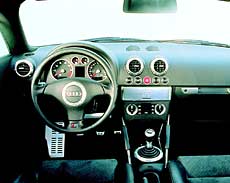 Grunden är av enkel konstruktion, vilket jag absolut inte håller för en nackdel. Audi TT är baserad på samma plattform som Audi A3, VW Golf och Bora, Skoda Oktavia och nya Seat Toledo, var och en folkvagnar i sin génre. Men där tar också likheterna slut, speciellt då det kommer till det starkare av de två motoralternativen. Den ungersktillverkade produkten är i detta fallet trimmad till 225 hk vid 5 900 r/min, något som uppnåtts med högre laddtryck, en större turbo samt nytt insug- och avgassystem. Samtidigt har kolvar, vevstakar och vevlager förstärkts för att klara den högre effekten. Och laddluftkylarna är två. På denna toppversion är dessutom fyrhjulsdrift standard (ett motoralternativ med 180 hk finns med antingen fram- eller fyrhjulsdrift) och när det står mig fritt att välja vilken version av TT-vagnarna jag vill börja provköra, spelar mig min karaktär inga spratt. Jag börjar från ovan. Som hos samtliga versioner har ingen detalj lämnats orörd gällande formgivningen av Audi TT, varken in- eller utvärtes. Jag behöver inte gå in på några detaljer, titta på bilderna. Det som inte kan illustreras är dock den nyvunna kraft som fyran på 1,8-liter och 20 ventiler presterar. En tidigare ganska platt maskin, både i 150 och 180 hk-utförande, är plötsligt en attraktiv sportvagnsmotor med klipp på höga varv. 0-100 på 6,4 sekunder och 243 km/h i topp, enligt fabriken akta dig Porsche Boxster! Den surrar innan rödmarkeringen, det förlåter jag en hårt trimmad fyra för.