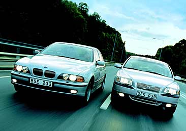 BMW och gaspedalsrespons är synonymer och den som gillar att sätta iväg i galopp blir ständigt uppmuntrad av den eggande råa raceljudskulissen som inte alls klingar värdig lyxbil. Övertaget i vridmoment mot Volvomotorn är påtagligt på höga varv och det bjuds intesivare fartökning även om tidsskillnaden upp till 160 km/h bara är försumbara 1,1 sekunder. Den standardmonterade automatlådan i BMW är utsökt, men inte lika imponerande som märkets manuella lådor. Den riktigt relevanta prestandaduellen vinner nämligen Volvo delvis tack vare växellådan. Kick down vid 80 eller 100 km/h, för en kvick omkörning, går alltid betydligt snabbare i Volvo som direkt tar en sekundsledning tack vare snabbare växling och turbomoment. Men efter några hundra meter, då de flesta omkörningar är över, kommer BMW:n ångande tack vare sin kraft på höga varv och fem växlar i stället för Volvos fyra. BMW-lådan tänker långsammare och har kännbart större förluster i momentomvandlaren. På riktigt kurvig svensk väg erbjuder Volvo den mer harmoniska drivlinan, färre växlingar, jäm nare kraftflöde och ett manuelläge som inte växlar upp vid rödmarkering. BMW 540i tappar kraft i böjarna. För att vara familjebilar på 1,7 ton (den högre, längre och bredare Volvon väger sex kilo mer) är leklusten och väggreppet mycket imponerande. Den tunga V8:an i BMW-fronten kan ibland tynga framfarten men i stort rullar den stabilt med god balans som hjälps upp av antispinn och ett raffinerat antisladdsystem som exempelvis kan bromsa hjul individuellt och gör framfarten snudd på idiotsäker. Styrningen är skön, trygg men något tung vid riktigt snabbt rattande, Volvo S80 känns avgjort nättare och livligare, styrningen svarar snabbare och har mer servoassistans. Men servotrycket byggs upp så abrupt att känslan ibland försvinner under ett kort ögonblick, vilket kan leda till en viss överreaktion och osäkerhet. Tack vare S80:s stora centraldator kan alla elektroniskt st yrda funktioner snabbt programmeras om och den som önskar trögare eller för den delen lättare styrning kan åka till Volvohandlaren för omkalibrering!