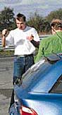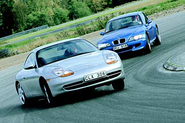 Min MCoupé vill inte räta upp sig och jag ser däcksrök läggas över grodans front. I med trean och snabbt bort mot esset, vräker in bilen i högern för att plocka upp den på returen i vänstern som bär av upp mot gamla velodromen. Det går brett men det driver, och jag skrattar så högt att jag överröstar ljudet av den vilt ylande sexan på 7 000 varv. När vi parkerar i depån kommer föraren i Porschen fram och tittar lite frågande på mig. "Vad höll du på med egentligen, var det något fel på bilen?" "Nä" svarar jag och försöker urskuldra mig, "men det syns inte på bild om man kör fort. Bara om man kör slarvigt". Fredrik Ekblom, regerande STCC-mästare, ser lite bekymrad ut så jag tillägger: "Men du är inte här för att köra fränt. Utan för att köra så fort det går". Då ser jag att Fredrik blir lugn igen. För det senare kan han. Bättre än de flesta andra, oavsett nationalitet. Just svansmotorbilar har han ett gott förhållande till, efter att ha kört Porsche Supercup 1992 (med två segrar på Spa-Francorchamps och Monza, båda i regn), och BMW tycks ju också fungera bra efter en vinnarsäsong med super touring-bilen i Sverige. Klart alltså för duell. Fredrik äntrar vår BMW MCoupé och stöter omgående på patrull. "För kort skjutmån, jag är för lång" (187 cm, reds anm). Han drar igen dörren och pyser iväg med det karaktäristiska metalliskt raspande ljudet av en hårt trimmad sexa ur de fyra kaxiga ändrören.