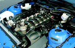 Vi följer den blåa, stubbiga sportkombin runt banan med blicken och ser den dansa genom knixarna i det nya partiet som har kapat bort den gamla velodromen från bansträckningen. Nästa varv: 1,20,90, och motorn låter verkligen välmående när den får gå med sex fullt öppnade trottelspjäll längs hela rakan. Fredrik kommer in och konstaterar bara att den går så här fort, varken mer eller mindre. Då är det så, förstår ni. "Verkligen kul under gaspådrag, nu förstår jag varför du körde så brett genom svängarna", skrattar han. "Det driver ju på fint trots att det går på tvären!" Det är diffbromsen och 245/40-mackorna bak som bäddar för greppet och bakaxelgeometrin med snett bakåtriktade länkarmar som hjälper till att bita fast den vid gaspådrag släpper man gasen svarar den istället med att lossa på greppet, blixtsnabbt. "Men det märks att den har smalare däck än Porschen (som har 265/35 bak), greppet är sämre både bak och fram. Det gör att den både understyr mer i kurvans ingång, och överstyr mer när man kliver på i utgången. Och bromsarna saknar det sista bettet". "Men vilken motor, den drar som ett lok på alla varv och växellådan är perfekt stegad!