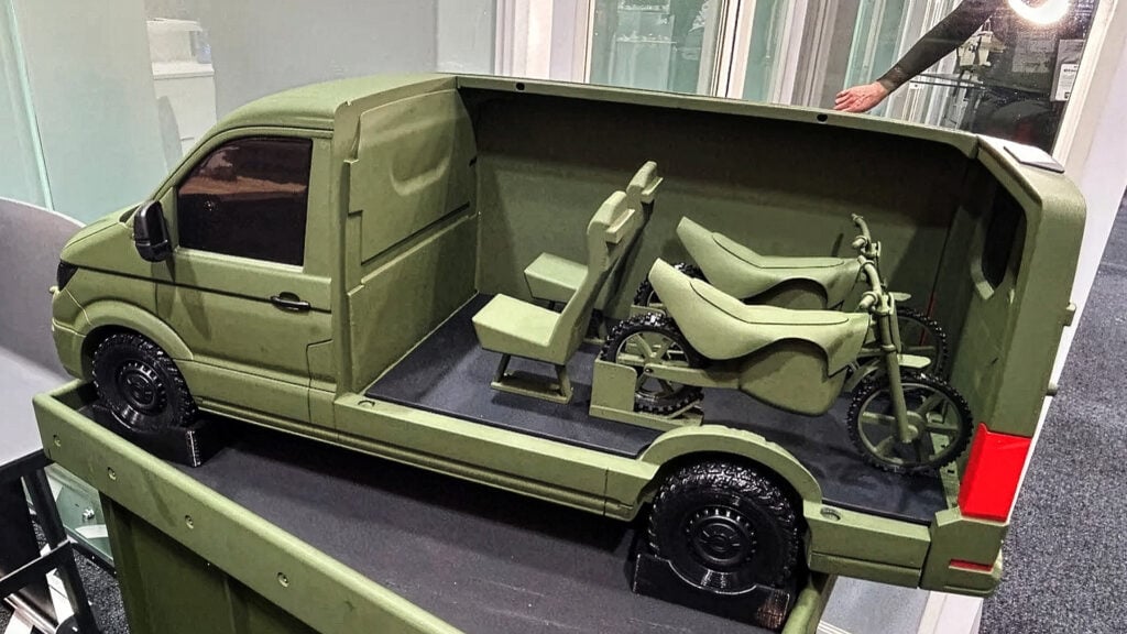 På mässan var flaket anpassat för att rymma en fyrhjuling med punkteringssäkra däck, tänkt att användas av specialförband, och utrustningsväskor.
